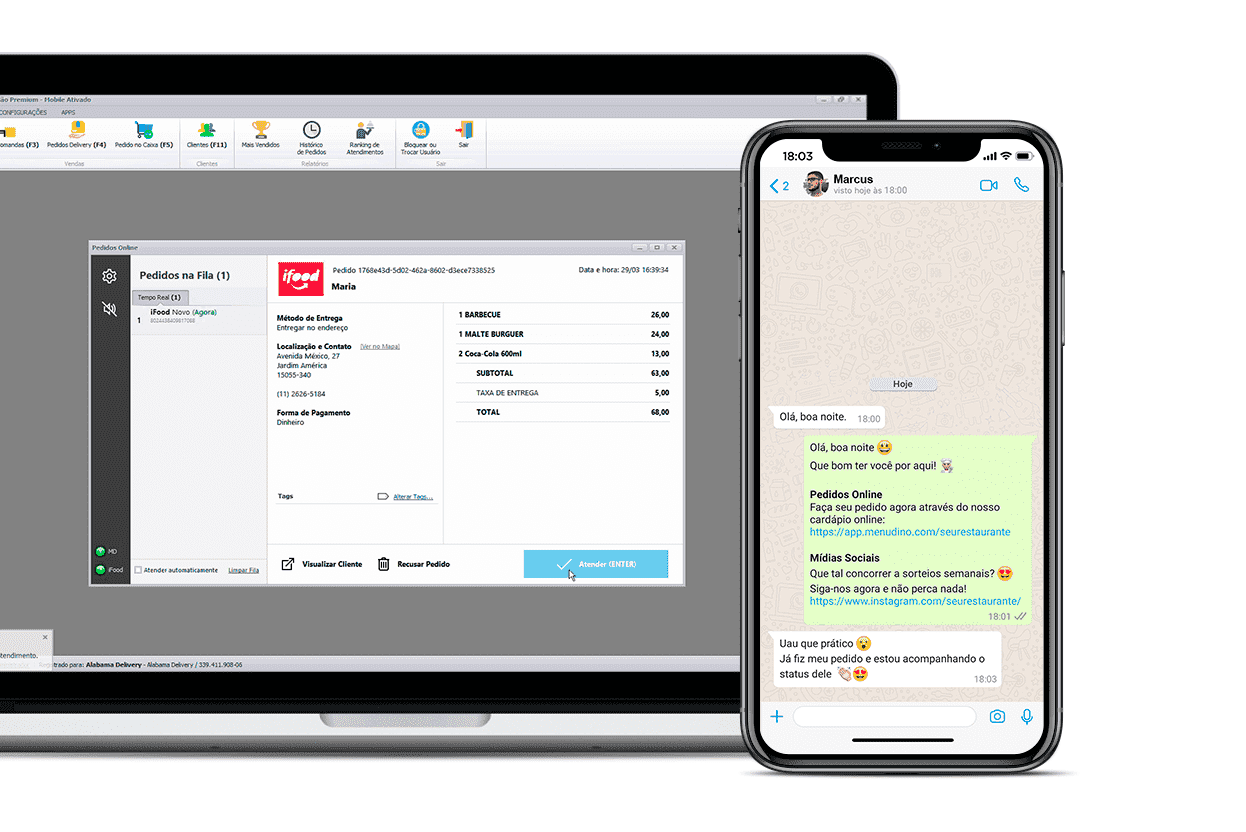 Telefone, MenuDino, iFood, delivery online ou vendas nas mesas e balcão: o Consumer é integrado a todos os seus principais canais de venda.